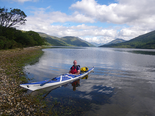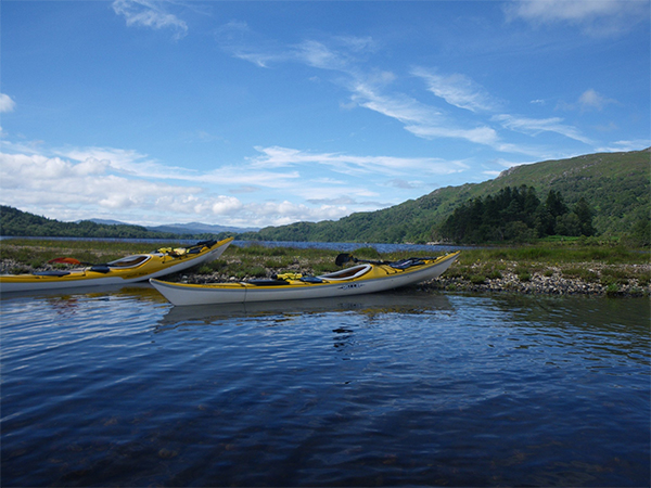 Six paddlers met at the Dalilea pier on the morning of the 12th August for a paddle up loch Shiel to Glenaladale. For a change, the sun was out, it was warm and there was no wind! A bit of time was taken up shuttling cars to the picnic site at the top of the hill as the parking is very limited at Dalilea. On the water by 11am, we hugged the north shore passing through the narrows at Finnan’s Isle and behind Eilean Camas Drollaman before stopping for a snack at Rubha na h Airde. Another six kilometres took us to Gaskan where we stopped to have a look at the cottage set amongst the impressive trees of Gaskan Wood. After a leisurely half hour soaking up the views and the sun, we set off for our final destination of Glenaladale where we hoped to set up camp and walk up the glen. The best laid plans…..! On arriving at the mouth of the river Aladale we found that cattle had trampled the grassy areas behind the shore making them useless for camping. Added to that an abundance of midgies and clegs made it even more uninviting! The group spread out looking for an alternative campsite further east. A terraced gravel beach proved to be the perfect spot and we soon had all the tents pitched and were ready for out first swim of the trip. By this time it was very warm and a dip in the loch was just the thing to cool us all down before dinner!