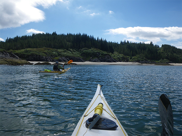 The planned three day paddle to Loch Hourn and walk up Glen Arnisdale was cancelled due to the prospect of increasing winds on the Sunday which would have made the return journey to Mallaig a real slog! However the forecast for Friday 1st June was OK so it was decided to do a one way paddle from Kinlochmoidart to Samalaman. Having run the shuttle four paddlers set off from the stone jetty just west of Kinlochmoidart in the rain but on flat calm water. We headed for Shona Beag and followed the shore round into Port Thairbeirt Dheas. From there we continued to follow the shore, paddling west past the pier and Shona House owned by Vanessa Branson. The rain eventually subsided and we were able to get a good view of the cottage at Bailetonach once lived in by Mike Tomkies, the author. His book “Between Earth and Paradise” describes his years living on Eilean Shona and getting close up and personal with the wildlife. We soon reached our lunch spot; the lovely Shoe Bay where we hunted for otter tracks and shared the space with walkers and a group who had arrived in two ribs. Venturing out of the South Channel and turning north after lunch we encountered rougher conditions, but the wind was behind us and we made good progress past the entrance to the North Channel and the white sands of Smirisary beach. After rounding Rubha Gheada Leighe we surfed towards Samalaman Island round which we paddled before landing at the beach. By this time the sun was shining! The planned three day paddle to Loch Hourn and walk up Glen Arnisdale was cancelled due to the prospect of increasing winds on the Sunday which would have made the return journey to Mallaig a real slog! However the forecast for Friday 1st June was OK so it was decided to do a one way paddle from Kinlochmoidart to Samalaman. Having run the shuttle four paddlers set off from the stone jetty just west of Kinlochmoidart in the rain but on flat calm water. We headed for Shona Beag and followed the shore round into Port Thairbeirt Dheas. From there we continued to follow the shore, paddling west past the pier and Shona House owned by Vanessa Branson. The rain eventually subsided and we were able to get a good view of the cottage at Bailetonach once lived in by Mike Tomkies the author. His book “Between Earth and Paradise” describes his years living on Eilean Shona and getting close up and personal with the wildlife. We soon reached our lunch spot; the lovely Shoe Bay where we hunted for otter tracks and shared the space with walkers and a group who had arrived in two ribs. Venturing out of the South Channel and turning north after lunch we encountered rougher conditions, but the wind was behind us and we made good progress past the entrance to the North Channel and the white sands of Smirisary beach. After rounding Rubha Gheada Leighe we surfed towards Samalaman Island round which we paddled before landing at the beach. By this time the sun was shining!