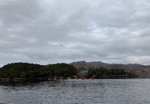 Much to our surprise and delight the weather for the follow-up paddle to the “Come and Try” day was perfect. The sun shone and Loch Morar was almost mirror calm! Boats were quickly offloaded from the club’s trailer and laid out on the beach at Bun an Loin bay. After a recap of the strokes practised the previous week and a couple of circuits of the bay to make sure everyone was comfortable in their boats, the group set off to explore the islands. The islands, which are thickly wooded with scots pines, make for an interesting paddle, with lots of nooks and crannies to explore. Keeping a tight formation, the group of ten paddlers hugged the north shore as far as Torr na Ba before crossing behind the elephant rock to Eilean a’ Phidhir. From there the group negotiated a narrow and shallow gap in Eilean Ghibbi before crossing to the south shore for lunch at a small beach between Rubha Garbh and Rhub’ Aird Cumnaich. After a sociable break and suitable rest time they set off to the east shore of Eilean nam Breac and into the little secluded bay boasting a wooden jetty. Having negotiated the narrow channels either side of the bay, the group set off towards An t-Eilean Meadhoin and on to Eilean Ban where a monastery was established in 1650. It was burned down by the Duke of Cumberland in 1746 and nothing remains of it today. From Eilean Ban the group returned to Bun an Loin where one hardy soul chose to practise some self and peer rescues. This paddle was a great starter trip for the group of beginners and hopefully they will continue to enjoy kayaking for many years to come! |