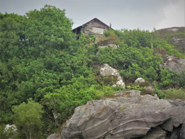 The weather was overcast, but the sea was flat calm as they went with the ebbing tide out through the South Channel of Loch Moidart, past Eilean Raonuill and out into the open sea. They paddled south round Farquhar’s Point under the steep sides of Carn Mor before passing Ardtoe and the entrance to Kentra Bay. On arriving at Camas an Lighe they ate lunch before walking to explore the remains of a hut in the forest which may have been part of the reality TV series “Eden:Paradise Lost” which was filmed in the area in 2016.