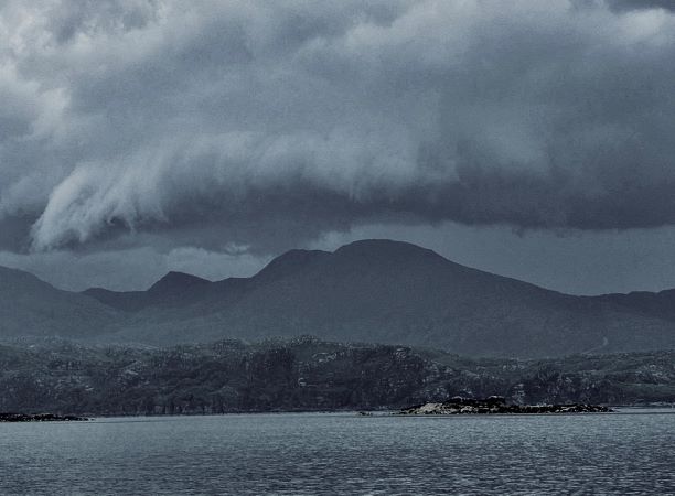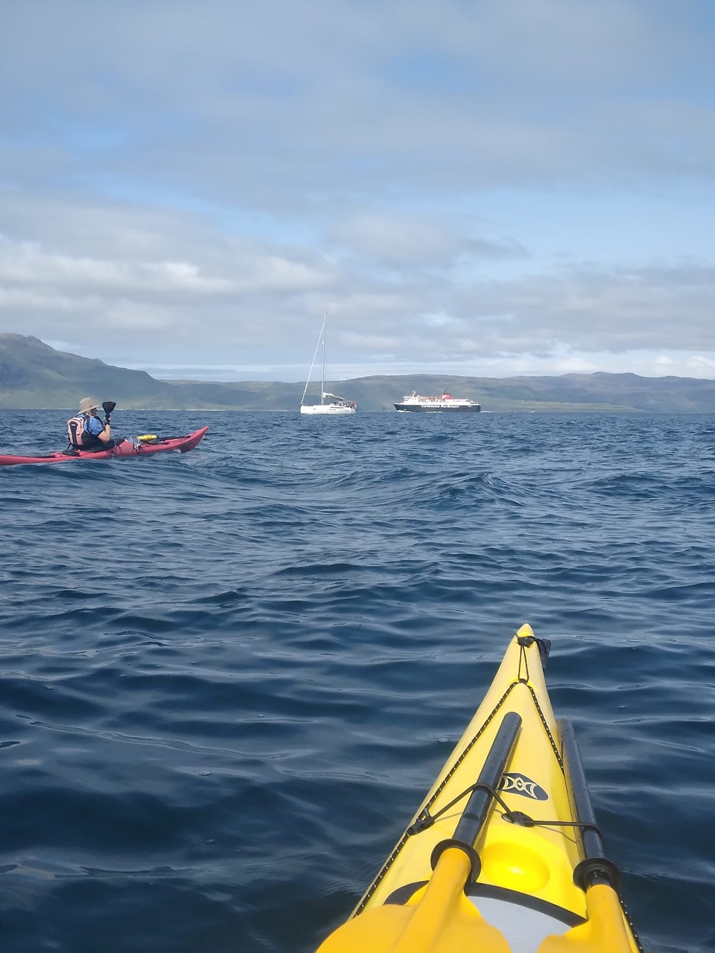 After much craic the boats were re-launched and an enthusiastic greeting was received at Ghaoideil bay by the resident party at the bothy. Having established that the previously absent ropes had been replaced with nice new ones, the descent and ascent (repeat) was made. Realising that the day was rapidly slipping by, and thinking that the possible wind gusts forecast earlier in the week for around 1.00p.m.had been and gone while we had lunch, boats were launched into a mirror-calm sea and, after sneaking through the previously inaccessible channel behind An Garbh Eilean, headed out across to the far side of Eilean nan Cabar. Approaching the westerly end of the island, some very “interesting” skies were noted to the windward south-west over the Roshven hills – a dark grey mass of cloud with a lighter rip-curl unfolding ahead of it like a giant wave. Ooh! “I hope there’s no lightning” was mentioned as the thunder rumbled and all stayed calm ..... until very suddenly it wasn’t. Wind gusted up to probably a force 5 and rain lashed down. Making for shore being the best option, it was a half hour slog with an awkward beam/following sea to achieve land fall in two groups in adjacent bays. VHF communication re-assured that all were safe, albeit extremely wet. After waiting out the rest of the storm the groups re-united on the water and had a leisurely paddle back to the viaduct, de-briefing on the experience. On this paddle were two paddlers who are among this year’s novices. Both did fantastically well and were enthused by the learning experience.