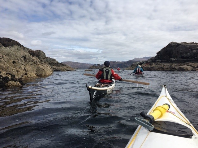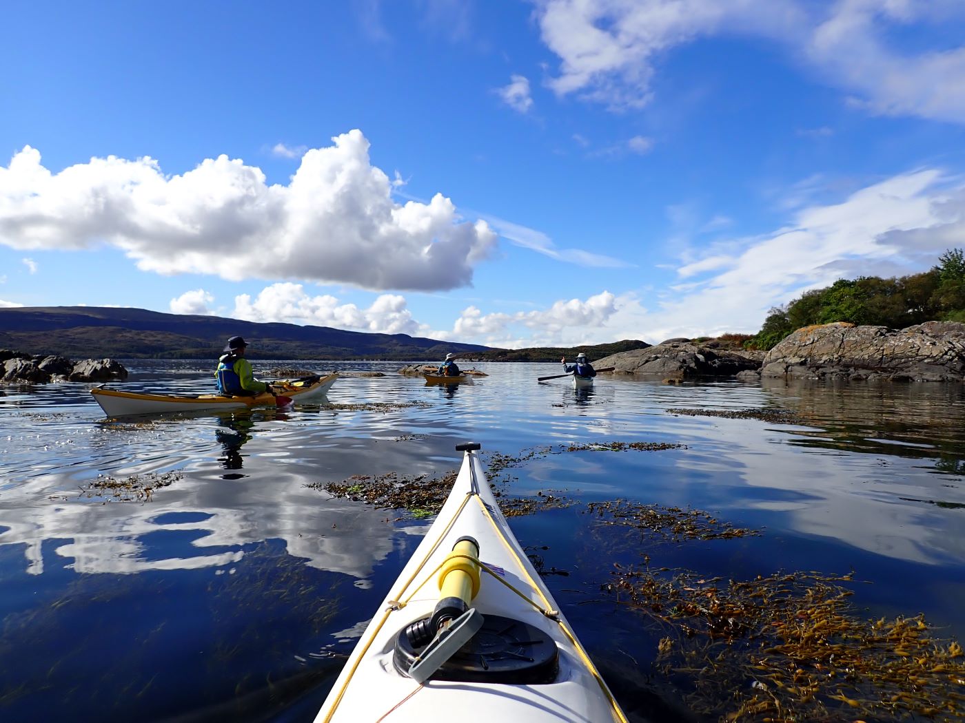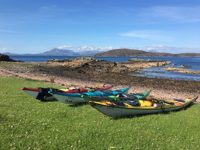 This was one of those summer days when coastal Lochaber seemed intent on showcasing all its finest features. The sun made an appearance, the wind did little to upset the sea, the small isles looked majestic, and the midges were enjoying a lie-in. A perfect day for a leisurely paddle around Loch nan Ceall, beginning and ending in Arisaig. Eight Club members set-off just before a mid-morning high-water, to ensure that they had sufficient water to get through the tidal channel between the Keppoch and Eilean Ighe. A leisurely pace was adopted; the boats gliding smoothly through unruffled water giving the paddlers tantalising glimpses to the seabed through swaying forests of bladderwrack; magical. A pull in on the sand beach at Gortenachullish, looking north towards Skye, was an ideal venue for a "first lunch." The conditions were so good that the team decided to change slightly from their advertised route to explore the west shore of Eilean Ighe. Lazy swells surging over the rocks and reefs gave a very enjoyable interlude to the sheltered waters inside the Skerries. Talk then turned to the question of where amongst the islets the best beach would be found for the much needed "second lunch". High water meant that there was a severe shortage of suitable real estate, and when on a couple of occasions, a suitable patch of sand was spotted it turned out to be already occupied by shore-parties from sailing boats in the south channel. After a looping exploration of the northern skerries, a tiny crescent of white sand was spotted and deemed to be big enough to accommodate 8 kayaks, and a landing was made. Once the party had consumed the rest of their rations it was decided that a B-line should be made back to Arisaig to get the barbecue lit for "lunch three". Of such days are memories made.
