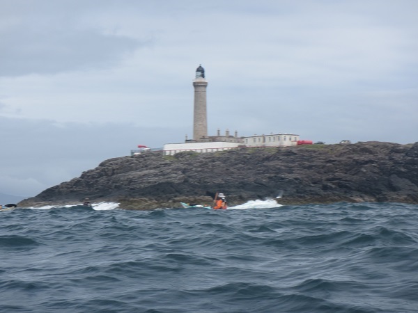 Expecting to wake to sunshine, it was disappointing to discover drizzle and grey skies but, by the planned shuttle time of 09:15 things were looking brighter. While the shuttle to Portuairk was effected, the remaining team stumbled down the stony shore with boats and kit ready for a 10:30 departure to maximise the journey round the Point. Getting away at 10:40 a 6km paddle into a comfortable force 3 got us to the wonderful little beach and hinterland at Eilean nan Seacdh Seisrichean (island of the seven sixes?). Although the time allowance was 30 minutes, a sunny hour of eating, chatting, admiring the vegetation and watching three birds, one hovering impressively on the spot above the cliffs (possibly a red kite) and 2 Peregrine falcons squabbling noisily up high, elapsed before re-embarking for the 4kms to the lighthouse, with whatever conditions that might bring (forecast following sea force 3/4 with 1.3m swell). A glance over the back suggested it would be more of the same, but experience proved to be a bit more challenging, with swell, clapotis, a following sea and a generally bumpy ride that required a good amount of focus and loose hips. Leaving the sheltered first lunch spot we took on the challenge of a line of incoming lively waves over rocks that proved to be fun rather than deadly. The lighthouse hove into view with much jubilation. Whilst most refrained from photography for fear of losing one thing or another, Iain, riding on Cloud Nine and clearly unphased by the rock and roll, impressively managed quite a few. Somewhere along the way a fantastically agile and very large fish (salmon?) was seen leaping vertically out of the water and returning with gravity three times. The Point passed and no crisis required immediate landing, so we continued on to the headland before Portuairk and convened to plan the onward route. Speeds of 11kms were achieved on this stretch, where we had the benefit of south westerly wind and the north easterly tidal stream pushing us along, with surfy waves to ride. It was originally thought we might continue round to Rubha an Dun Bhain or beyond and maybe check out the caves and Dun, but strengthening winds from the SW discouraged this, so it was agreed to paddle across to the far Sanna beach, where the tide was by now low but incoming, for a celebratory cake-fest. By this time Sanna was living up to its Caribbean reputation (but much, much better) with bright blue skies and sparkling blue seas. Views across to the cliffs of Muck were striking. Dragging the boats up the beach we encountered Roddy McDowell (Kayak Bute) who noted a Tiderace boat and various connections were made. As the boats began to drift about on the incoming tide a move was reluctantly made to continue. An outward trajectory being proposed, we headed out into more lively seas and wind and set our sights on Portuairk (which we now knew how to pronounce) where the vehicles were parked up the hill. The tide being still fairly well out (day before Springs), the haul up the beach was rather protracted. A later arrival would have facilitated a more easterly approach up a watercourse. Azure seas and skies of an indescribably bright blue made this all a pleasure. It was just a shame that we weren�t continuing the journey. Farewells and shuttles were made and everyone went their way with memories of a foreshortened but brilliant trip.