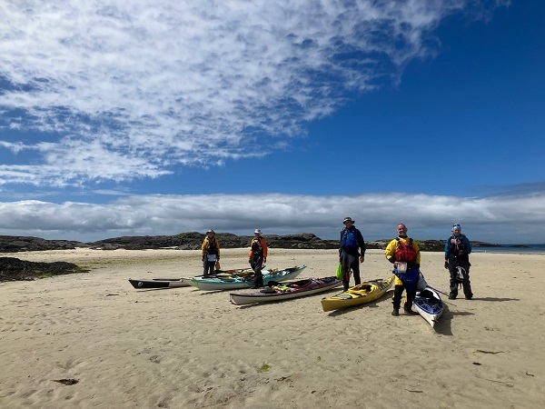 Seven paddlers set off from the beach just west of Alisary on the road between Lochailort and Glenuig on a calm sunny day with a promising forecast. This was a relief after the wet and windy weather of the past few weeks. As the forecast was so good, it had been decided to extend the trip to take in a visit to Camas Ghaoideil across Loch nan Uamh on the Rhu peninsula. After crossing Loch Ailort, the group paddled behind Eilean Buidhe on the outgoing tide and followed the shore having a look at the ruins of Peanmeanach and Glasnacardoch before stopping for first lunch (there are always two!) at the beautiful beach known to the club as “The Singing Sands”. Strangely this lovely stretch of pristine sand is not marked on the OS map. Here they were lucky enough to spot a beautiful adult sea eagle flying overhead, white tail flashing against the blue sky. Feeling refreshed the paddlers rounded Rubha Chaolais (Headland of the Strait) and passed the ruins at Sloch before heading northwest to Ghaoideil. After the 4km crossing and weaving their way through the many island guarding the entrance to Loch Nan Uamh they all landed safely on the steep stony beach beneath the bothy perched precariously atop a cliff. Another group of kayakers from the east coast was lunching at the bothy, so the paddlers decided to eat on the beach and gather some plastic to take away before setting off to paddle the 6km back to the takeout at the beach below the Glen Mama viaduct. A great day!