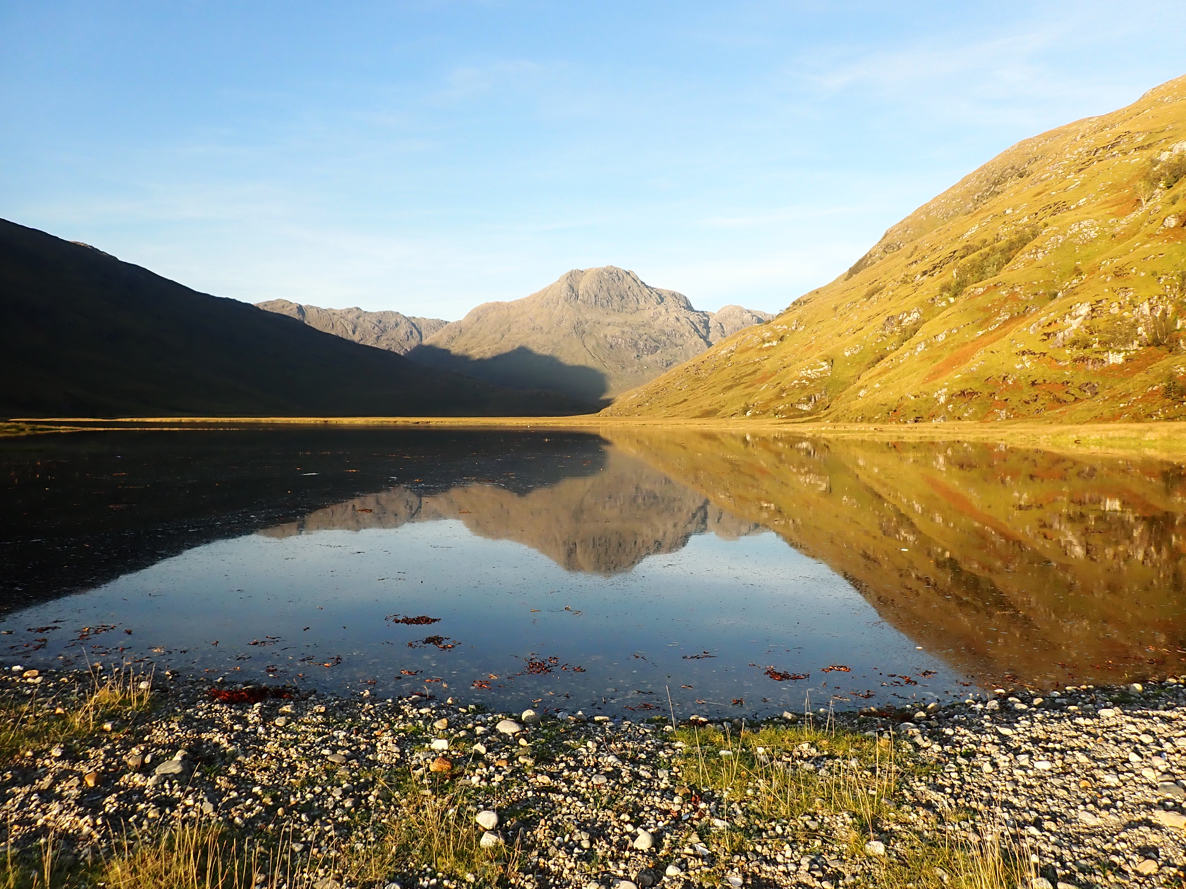 After the wettest of summers everyone was holding out for an Indian summer…and by golly the week beginning 16th September certainly delivered with perfect weather to undertake one of the calendar’s notional paddles to the head of Loch Nevis. The short notice meant that only two members set off from the slip below the boardwalk and paddled past the Lord of the Isles before turning into Loch Nevis on the calmest of seas under the bluest of skies. An hour of easy paddling brought the pair to the beach behind Eilean Giubhais for a quick cuppa before turning into the loch proper. After passing the fish farms they reached Stoul where great swathes of the hillsides are covered in the parallel lines of old lazy beds. Another quick stop was taken at Ardintigh before they paddled past Tarbet Bay and into the swirling waters of the narrows where the spring tide was gathering pace. Around 6km later they arrived at Sourlies Bothy where mercifully the tide was well in (it can dry out for over a kilometre there!). After a quick look round the bothy the paddlers returned to their boats and paddled round to the narrow stretch of land leading out to Eilean Tioram where they pitched the tents on a narrow stretch of raised ground behind the beach. Having anxiously watched the tide creeping ever closer to the tents a quick dinner was cooked after high water before the pair turned in for the night watched over by a herd of deer who were totally unconcerned by their presence.